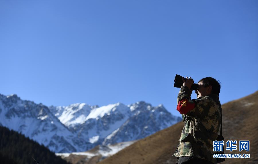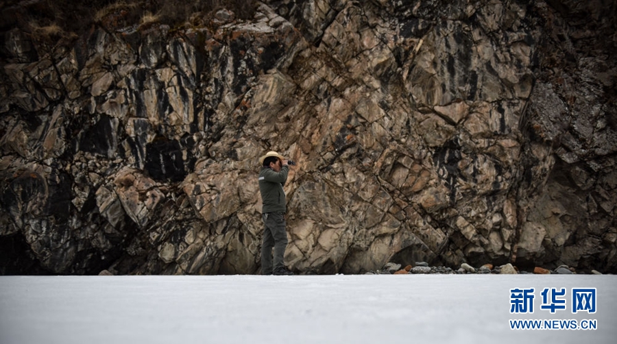 4月23日,祁連山國家公園沙龍灘管護站生態管護員羅藏次成在巡護途中使用望遠鏡監測野生動物。新華社記者 吳剛 攝