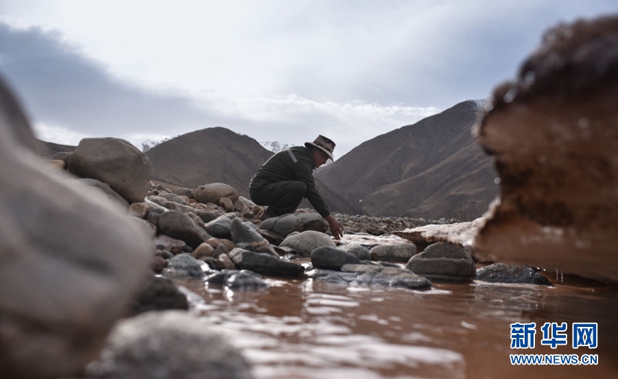 4月22日,祁連山國家公園油葫蘆管護站生態管護員普華才讓在巡護途中洗手。新華社記者 吳剛 攝
