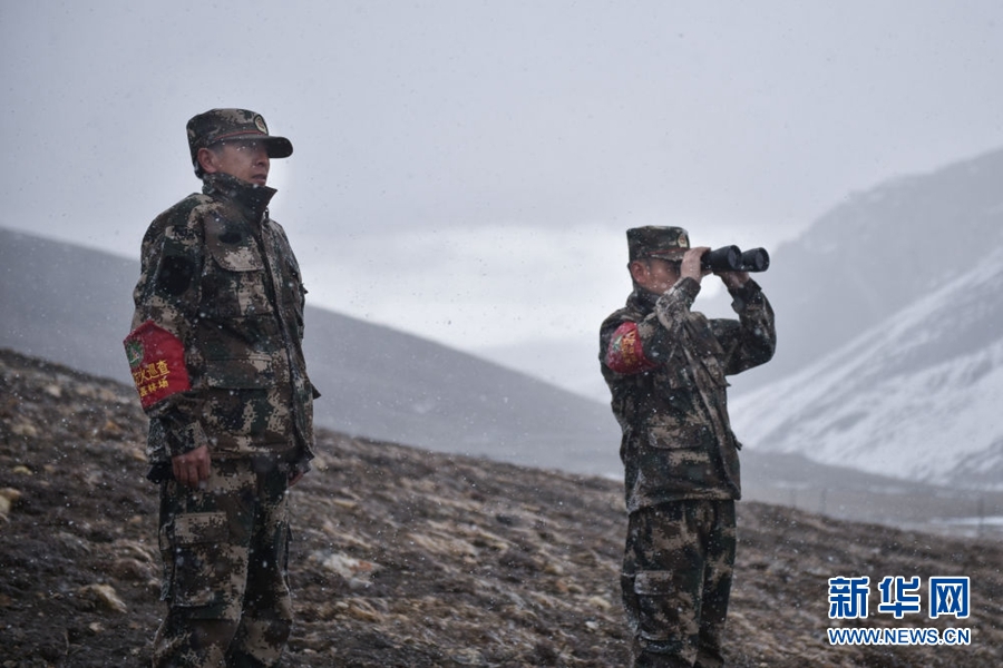 4月23日,祁連山國家公園沙龍灘管護站生態管護員羅藏次成(右)在巡護途中使用望遠鏡監測野生動物。新華社記者 吳剛 攝
