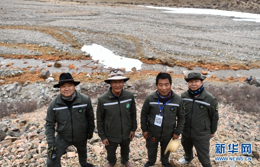 4月22日,祁連山國家公園油葫蘆管護站生態管護員德康、普華才讓、王學清、朱江云(從左至右)在巡護途中合影。新華社記者 張宏祥 攝