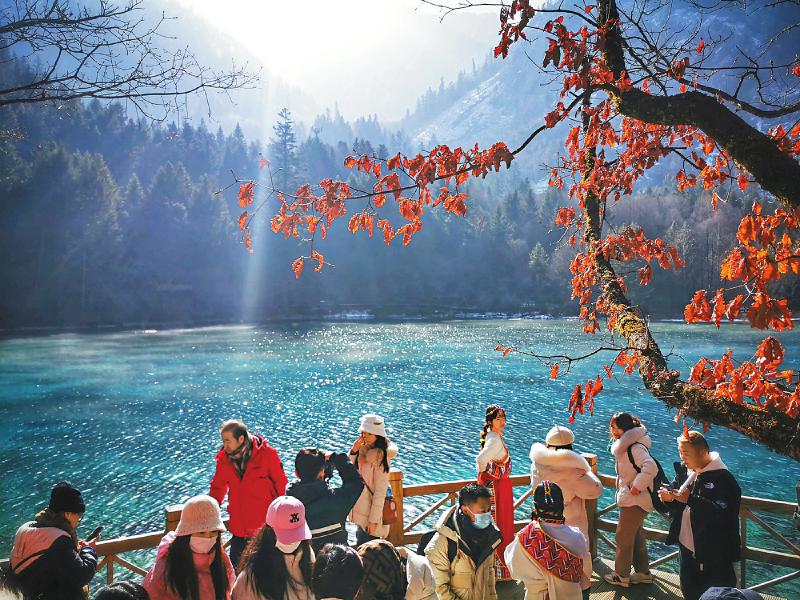 2月14日,來自遼寧的游客郭婷和男友在九寨溝風景名勝區的五花海棧橋上拍了一組照片發在朋友圈,并配上文字:“兔年第一站,打卡九寨溝。”