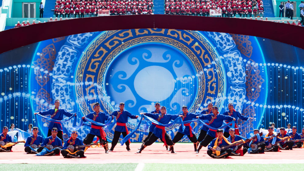 8月1日,當地群眾在海南藏族自治州成立70周年慶祝大會上表演。新華社記者 解統強 攝