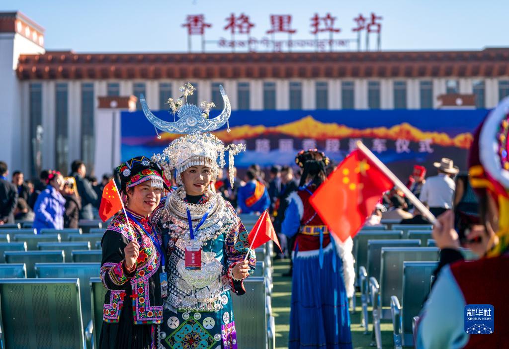 11月26日,參加麗香鐵路開通儀式的少數民族代表在開通儀式上拍照留念。新華社記者 陳欣波 攝