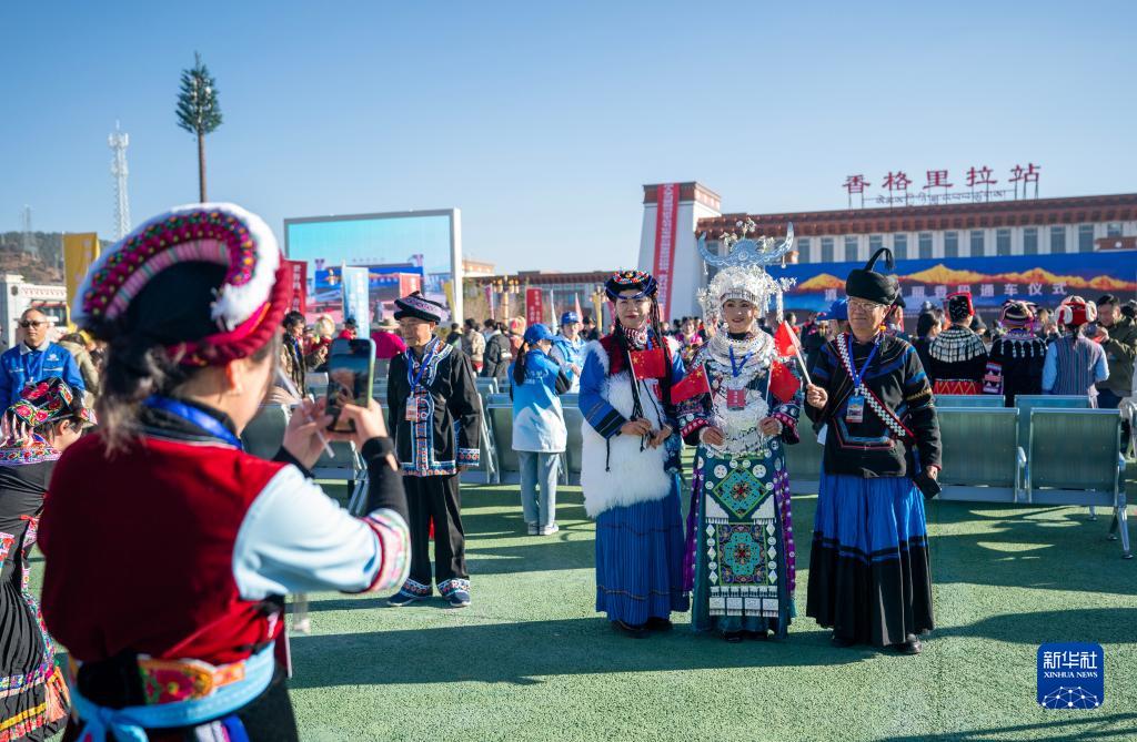 11月26日,參加麗香鐵路開通儀式的少數民族代表用手機拍照留念。目前,中國移動已實現麗香鐵路及沿線周邊區域4/5G信號100%覆蓋。新華社記者 陳欣波 攝