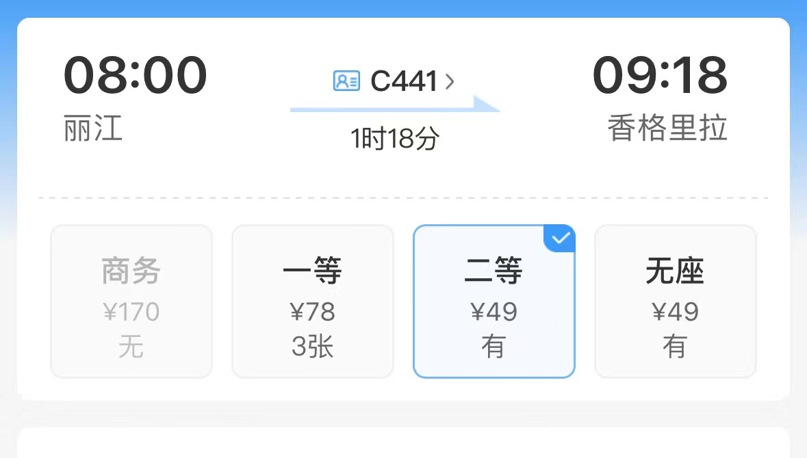 運營初期執(zhí)行票價最高為公布票價的9折,最低為7折。麗江-香格里拉段動車二等座票價為49元、63元。香格里拉-麗香段動車二等座票價為56元、63元。已知麗香段全長139.7公里,最實惠的一趟動車折合人民幣僅需0.35元/公里,考慮到73.4%橋隧比的修建難度,性價比極高!