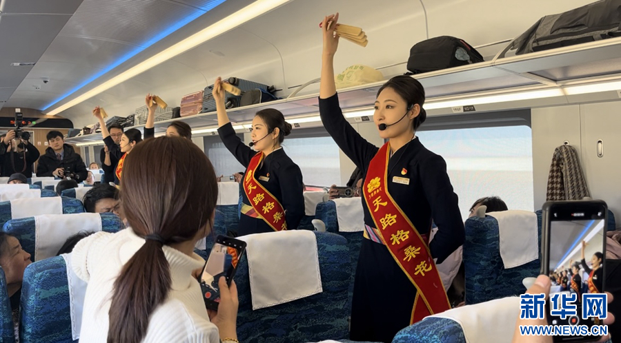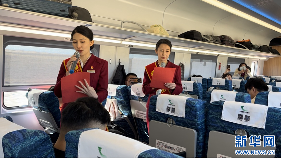 車廂內,喜慶的燈籠高高掛起,紅色的對聯、剪紙點綴其間,濃厚的新年氛圍撲面而來。過道里,乘務員們的律動操、音樂快板、詩朗誦等精彩節目令人目不暇接,乘客們紛紛拿起手機拍照錄像記錄。
