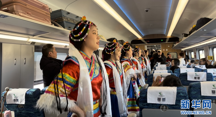 “提前祝各位旅客新春快樂,吉祥如意,扎西德勒!”藏族舞蹈《吉祥歡歌》把車廂內的氛圍推入高潮,鐵路職工身著藏族服飾,歡快的音樂和動人的舞姿令人陶醉,乘客們的情緒也被帶動起來,隨著表演者們一起拍手歌唱。