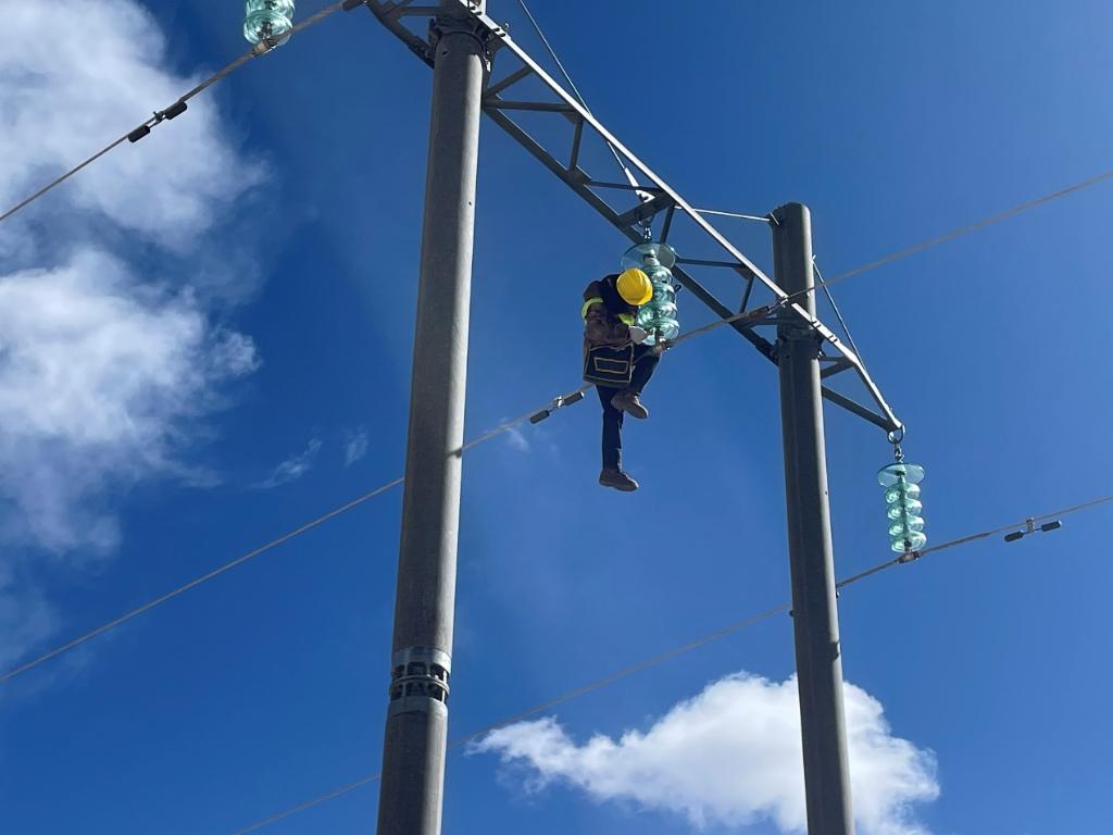 風(fēng)吹得高壓線輕輕晃動,鐵軌兩邊都被白雪覆蓋,大家剛一下車就感受到了來自唐古拉的寒意。“今天檢修任務(wù)是布強格至唐古拉北45號桿塔至245號桿塔,重點是線路、絕緣子檢修、鐵塔、電桿狀態(tài)檢查等工作,海拔高、氣溫低,裝備穿戴笨重,登高作業(yè)大家要注意防止跌倒、墜落。”應(yīng)忠學(xué)怕自己的聲音被風(fēng)吹得模糊,他又大聲喊了一遍,保證每個人都能聽到。