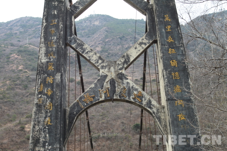 不難看出,大渡河橋至今保存完整。東橋塔上清晰可見劉伯承同志當年揮筆寫下的“大渡河橋”幾個大字,揮筆毫末間仍然能感受到當年建橋完成的喜悅激動之情。橋的兩側是朱德總司令親筆為該橋題寫的橋聯:“萬里長征猶憶瀘關險,三軍遠戍嚴防帝國侵”。因位置限制,西橋塔暫時無法親眼目睹,據瀘定縣文物考古研究所副所長葉丹介紹,西橋塔上有廖志高同志為該橋題寫的橋聯:“河水南流任澎湃波濤難阻當年紅軍奮勇前進創造光輝記錄完成長征奠下了勝利基礎;旌旗西指看神勇大軍全掃康藏殘敵努力建設力求民族幸福實現團結組織友愛家庭”。