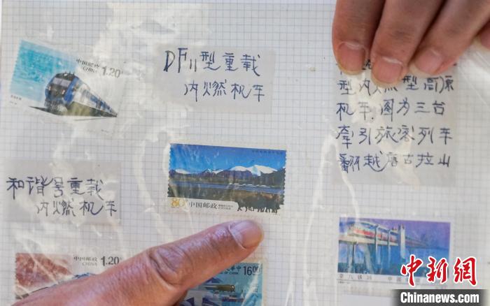 圖為徐超展示其收藏的中國郵政為紀(jì)念青藏鐵路全線建成通車,于2006年7月1日發(fā)行的一套紀(jì)念郵票中的其中一枚名為《列車駛過唐古拉山》的郵票。 馬銘言 攝