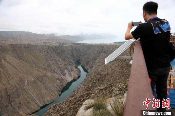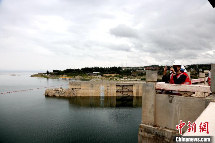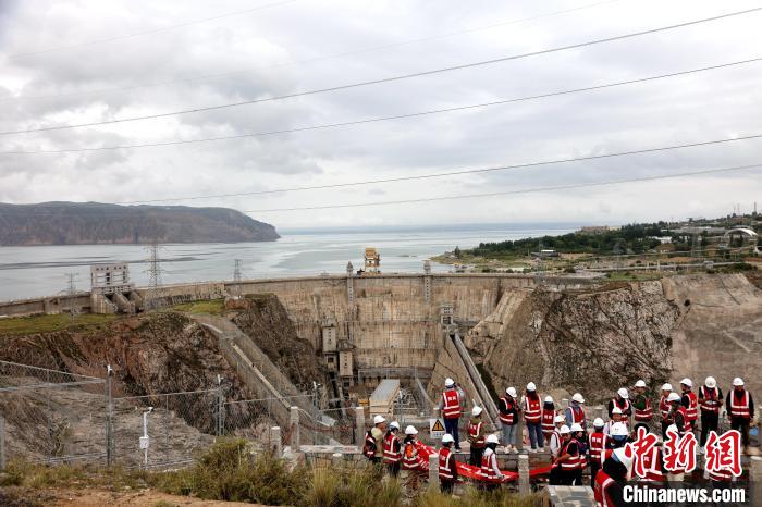 圖為網絡名人及媒體記者眺望龍羊峽水電站大壩。中新社記者 張添福 攝