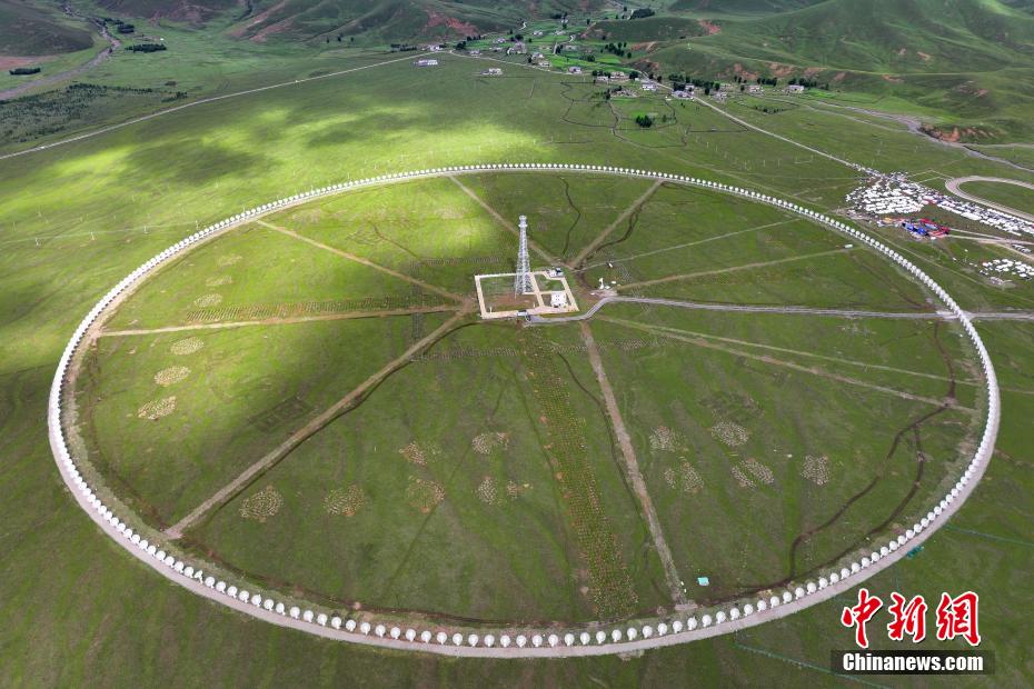 7月22日,四川稻城縣,草原上的圓環陣太陽射電成像望遠鏡。(無人機照片)中新社記者 劉忠俊 攝