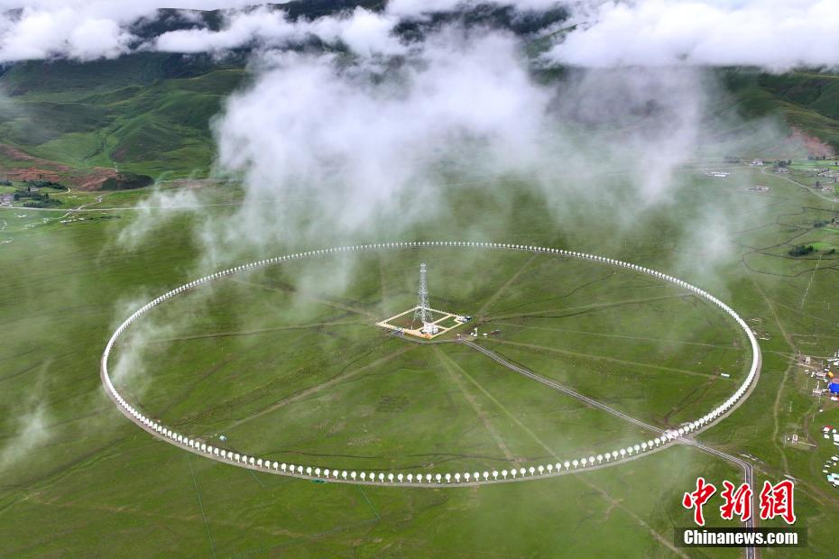 7月22日,四川稻城縣,云霧下的圓環陣太陽射電成像望遠鏡全景。(無人機照片)中新社記者 劉忠俊 攝