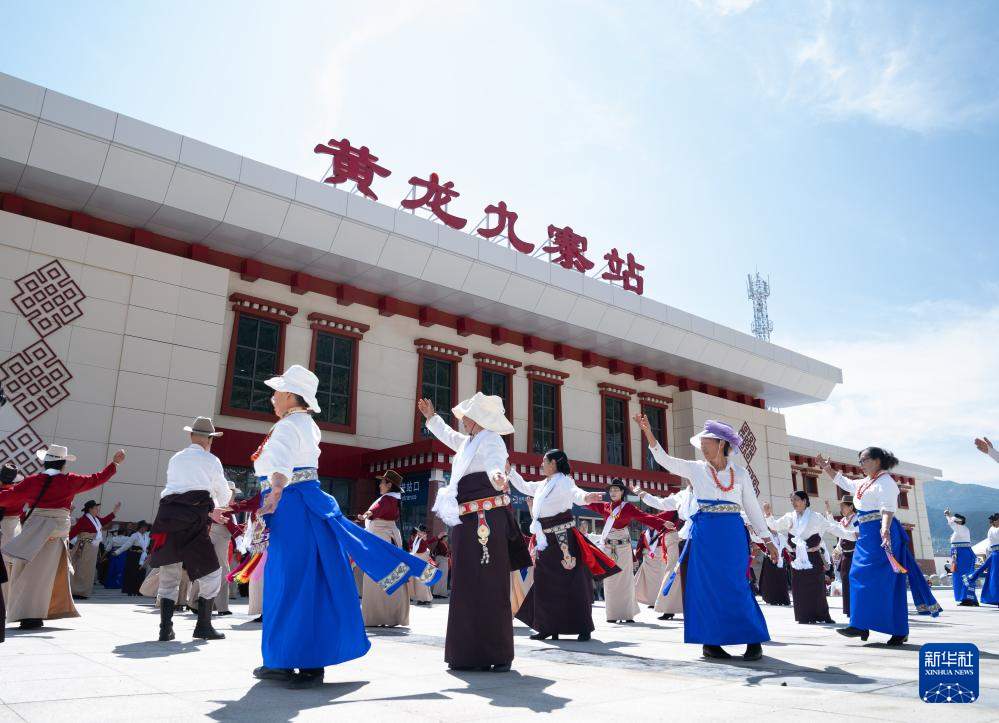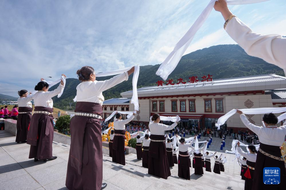 8月30日,在黃龍九寨站,當地群眾在川青鐵路鎮江關至黃勝關段開通首發儀式上跳舞慶祝。新華社記者 江宏景 攝