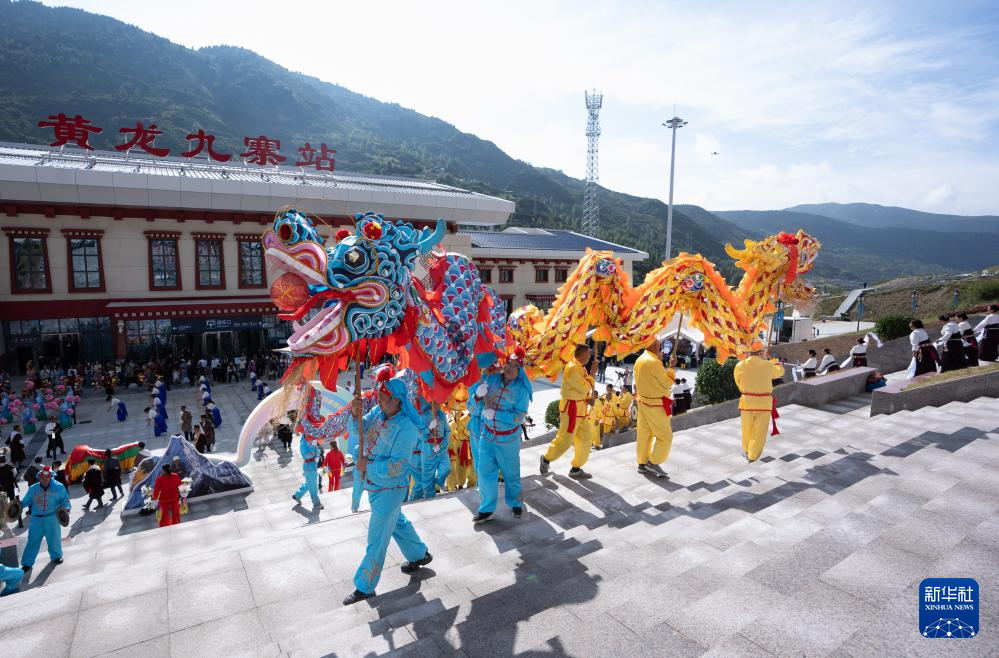 8月30日,在黃龍九寨站,當地群眾在川青鐵路鎮江關至黃勝關段開通首發儀式上舞龍。新華社記者 江宏景 攝