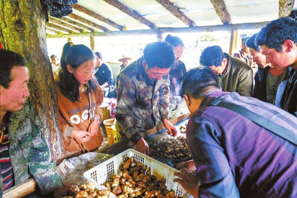 木里縣博窩鄉存則洋松茸山臨時交易市場內,人們正在交易松茸。