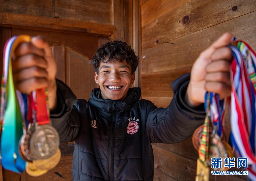 在位于西藏林芝市墨脫縣德興鄉巴登則村的家中,旺前羅布展示自己獲得的獎牌(2月9日攝)。新華社記者 孫非 攝