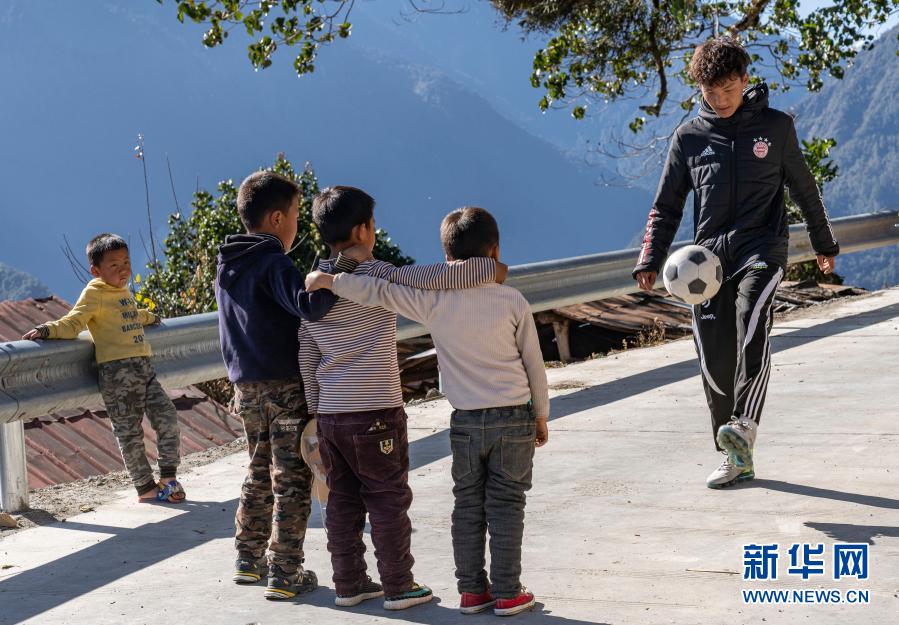 在西藏林芝市墨脫縣德興鄉巴登則村,旺前羅布向弟弟們展示自己的球技(2月9日攝)。新華社記者 孫非 攝