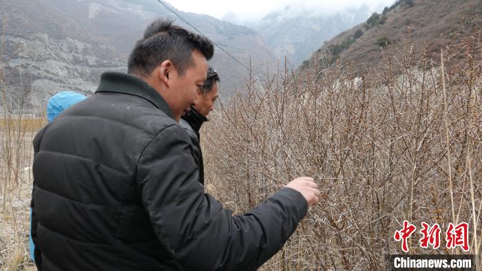 圖為次仁多布杰在查看沙棘生長情況 謝牧 攝