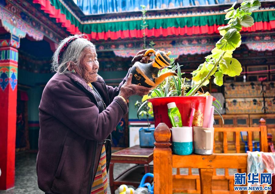 沖多在家里澆水養花(1月15日攝)。新華社記者 晉美多吉 攝