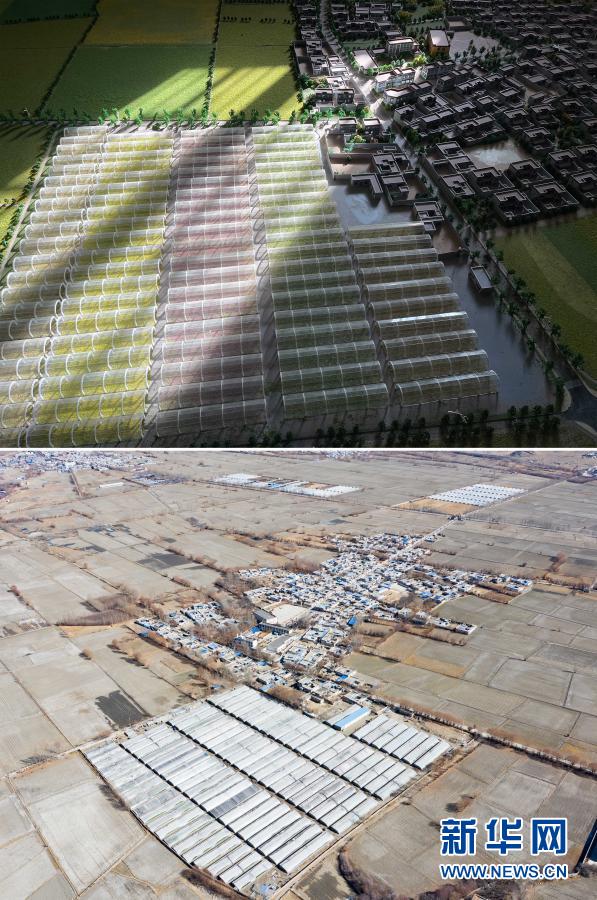 拼版照片的上圖是西藏山南市乃東區克松社區農業產業生產基地規劃沙盤(2月9日攝);下圖是克松社區農業產業生產基地(2月9日攝,無人機照片)。新華社記者 普布扎西 攝