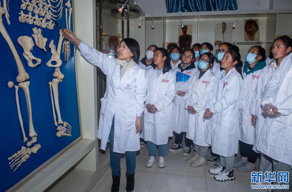 西藏藏醫藥大學藏醫系現代醫學教研室宗詠花老師在講解人體骨骼構造(3月23日攝)。新華社記者 旦增尼瑪曲珠 攝
