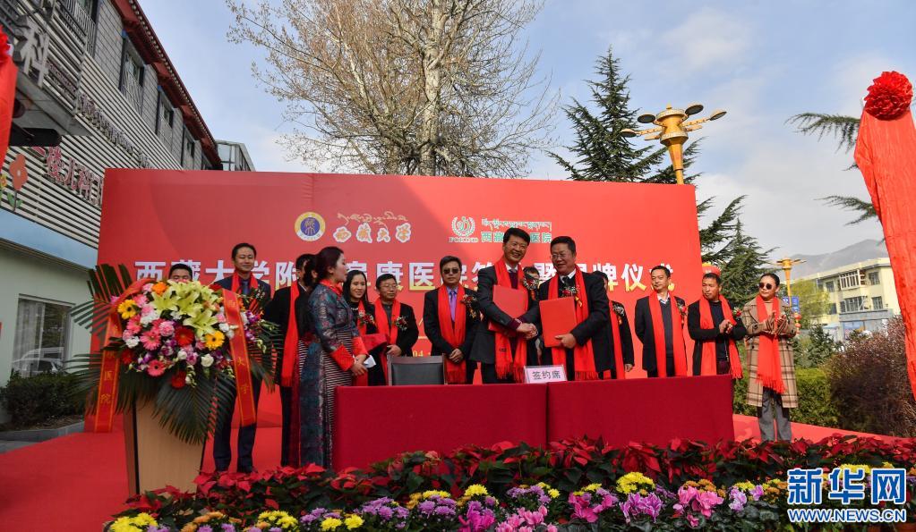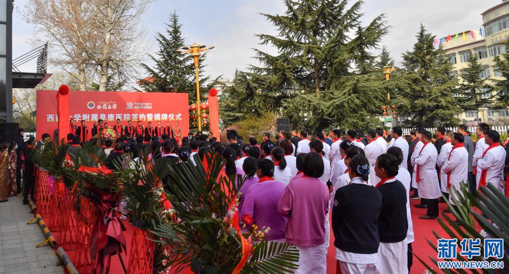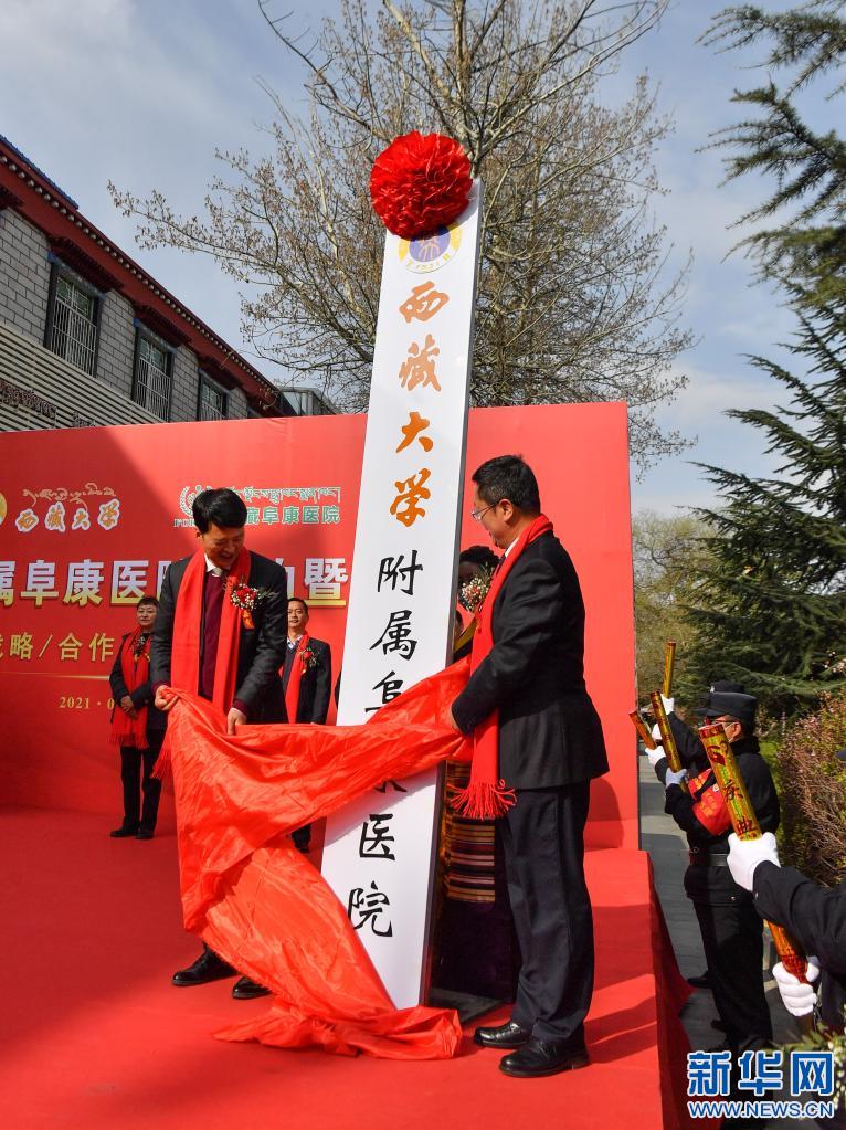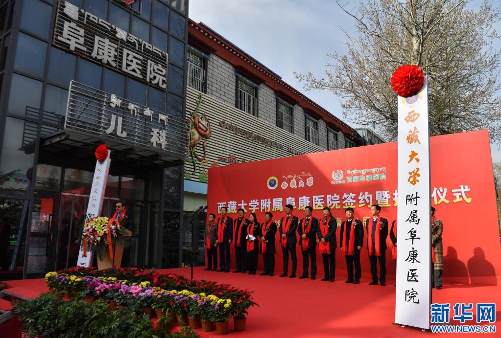 西藏大學附屬阜康醫院簽約暨揭牌儀式現場(4月7日攝)。