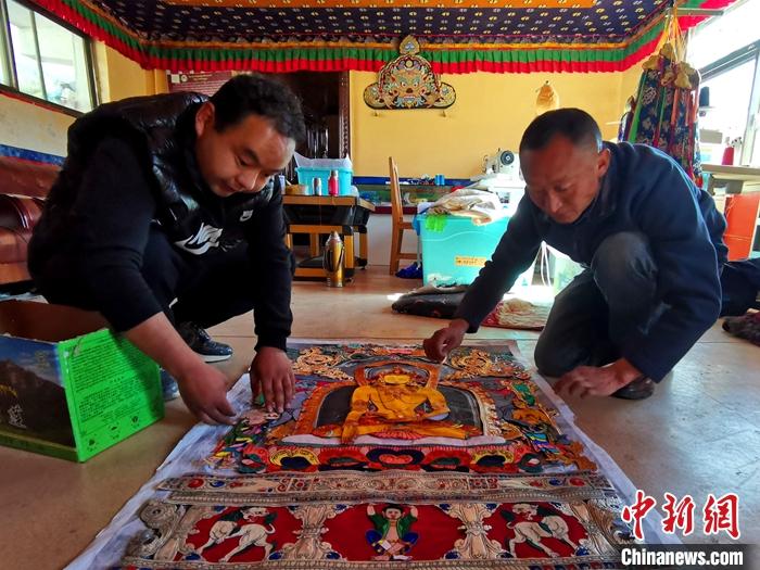 4月5日,拉薩堆繡唐卡技藝傳承人羅布(右)正在和學生共同完成一幅新的堆繡唐卡。中新社記者 趙延 攝