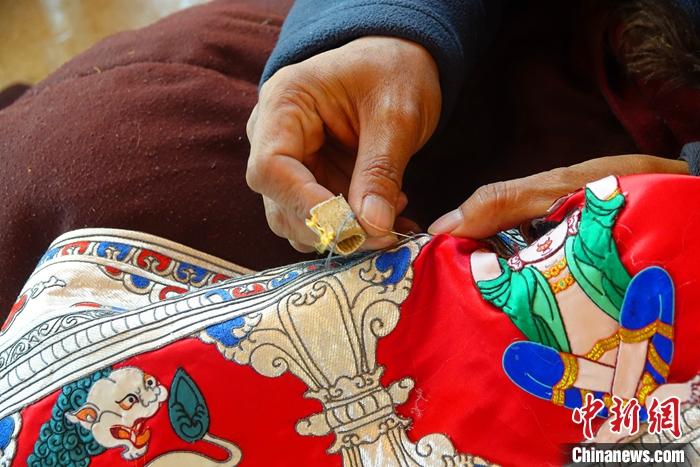 4月5日,拉薩堆繡唐卡技藝傳承人羅布正在進行創作。中新社記者 冉文娟 攝