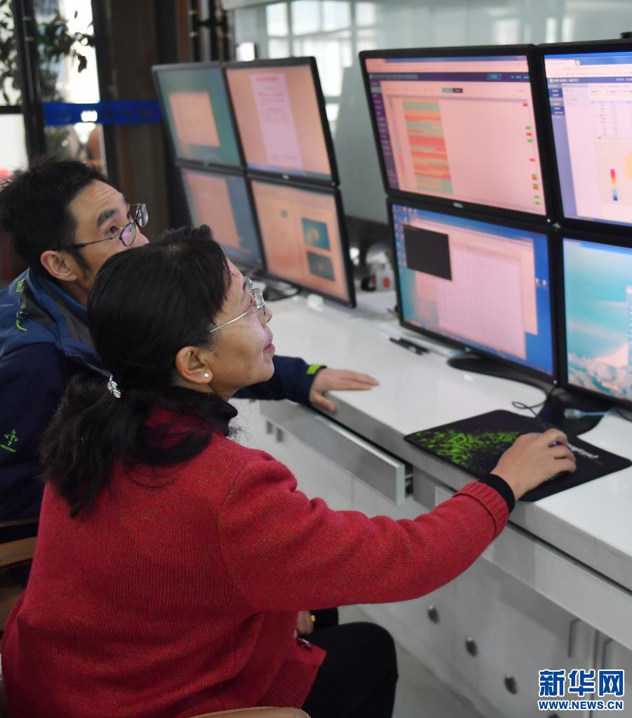 卓瑪(右)和同事在西藏自治區氣象局的辦公室討論氣象數據(3月12日攝)。新華社記者 孫瑞博 攝