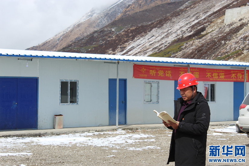 姚紅紀在拉康項目施工點為工人講黨課(4月24日攝)。新華網發 (王雙雙攝)