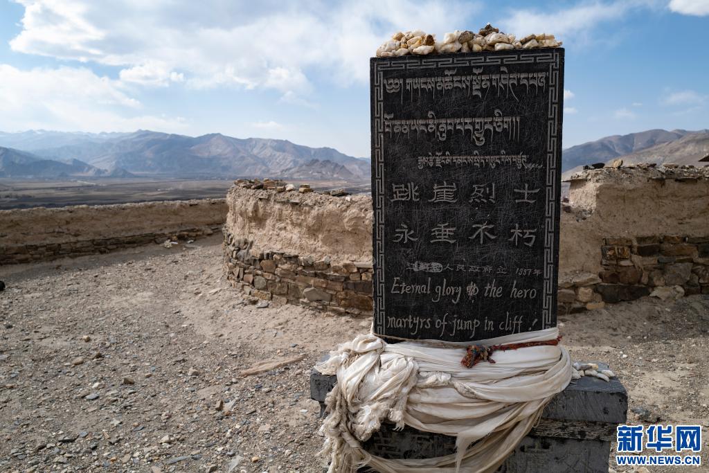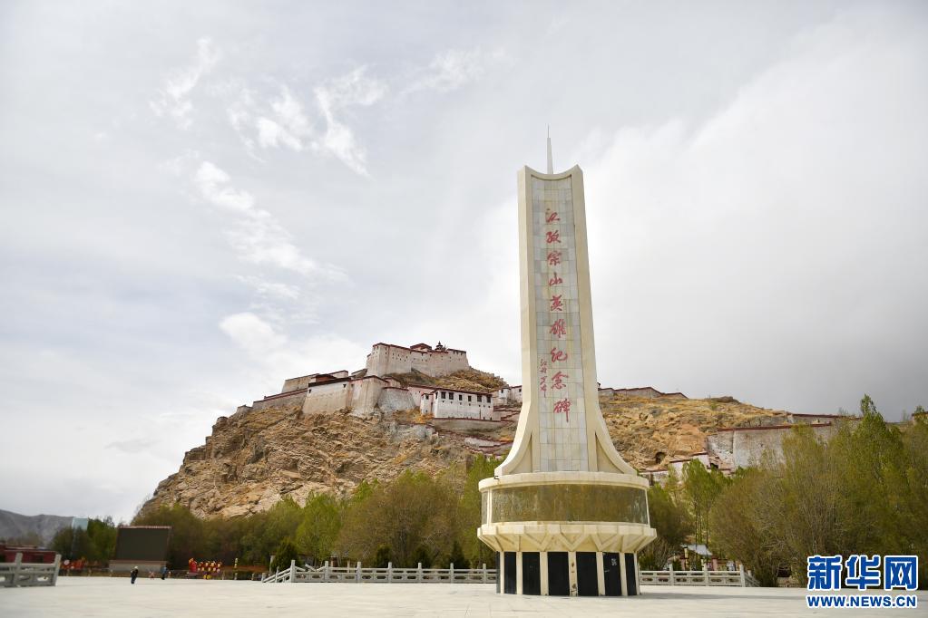 這是3月23日在江孜宗山古堡拍攝的跳崖英雄紀念碑。新華社記者 孫瑞博 攝