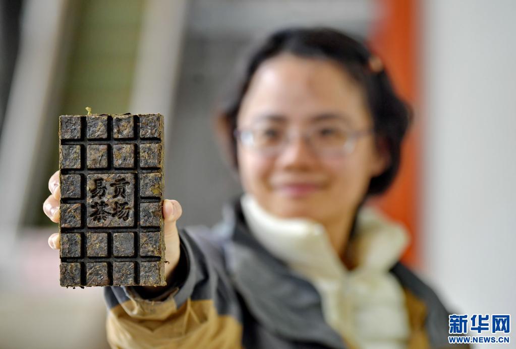 西藏易貢茶場的一名工作人員展示生產的特色茶磚(5月22日攝)。新華社記者 張汝鋒 攝