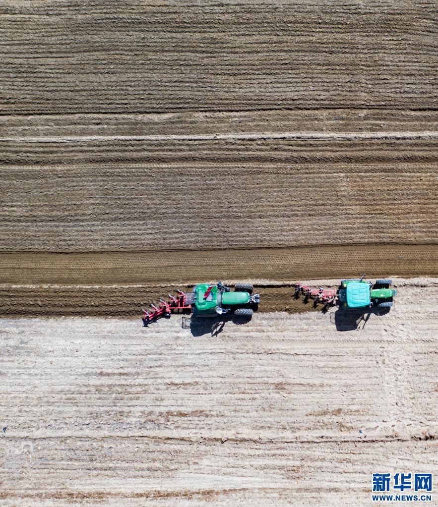 西藏拉薩市曲水縣茶巴朗村農民利用機械設備播種“藏青2000”(無人機照片, 2020年4月22日攝)。新華社記者 普布扎西 攝