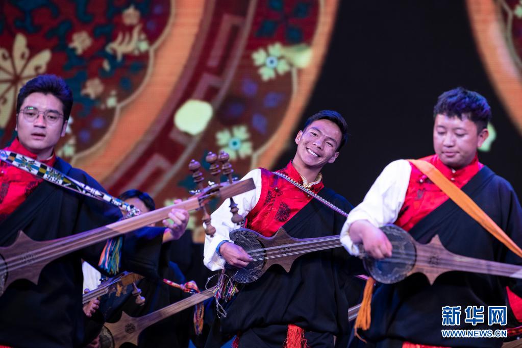 6月12日,在西藏拉薩市的自治區群藝館,演員表演扎念彈唱《普伊桑林貢巴》。新華社記者 孫瑞博 攝