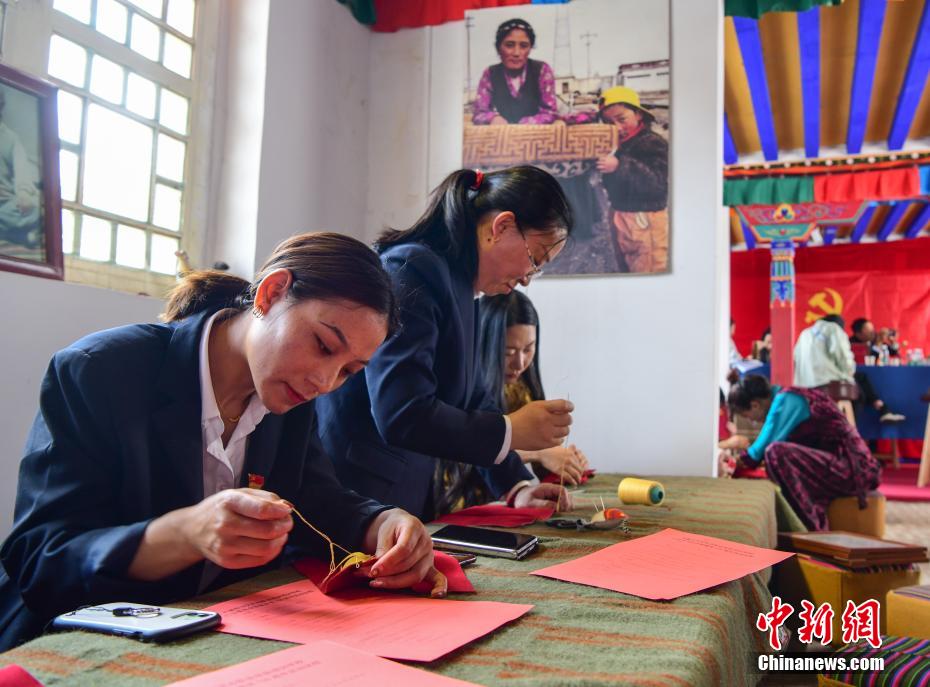 圖為西藏自治區民辦職業技能培訓學校行業黨員縫制黨旗。貢嘎來松 攝