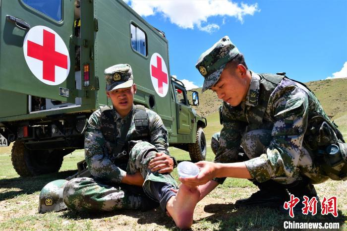圖為西藏軍區某合成旅野外拉練途中處理官兵腳傷。萬玲 攝
