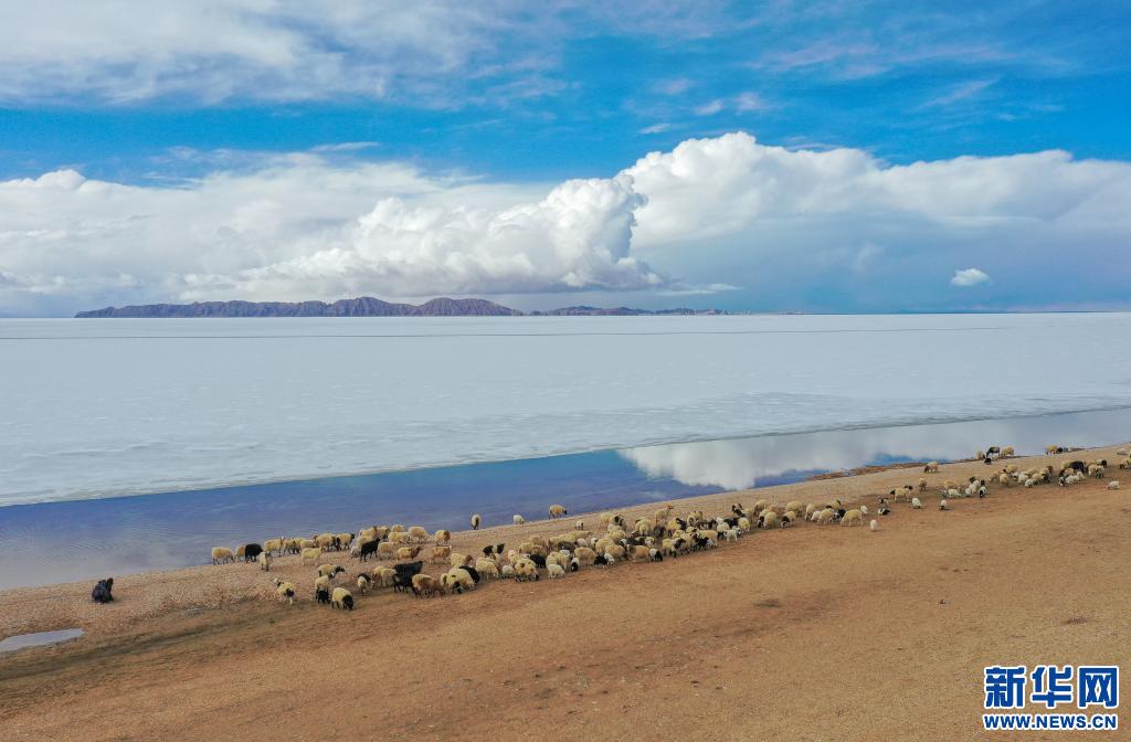 牧民指揮羊群從色林錯經過(2020年4月29日無人機攝)。 新華社記者田金文 攝