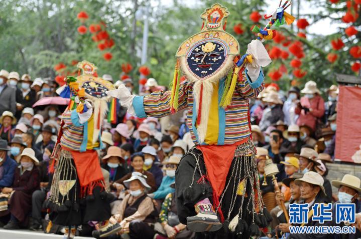 拉薩市堆龍德慶區(qū)馬鄉(xiāng)措麥村民間藏戲隊在表演藏戲(2021年6月12日攝)。新華社記者 春拉 攝