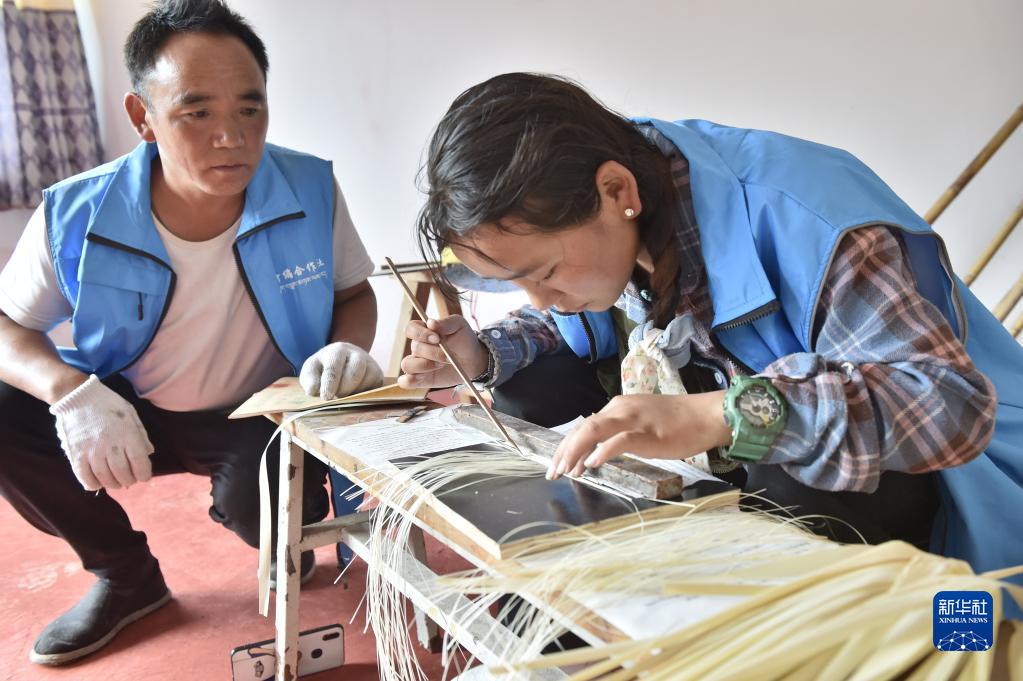 9月15日,西藏定結縣陳塘鎮農民、夏爾巴竹器手工藝傳承人加布(左)指導村民用竹皮編織唐卡。新華社發(索朗羅布 攝)