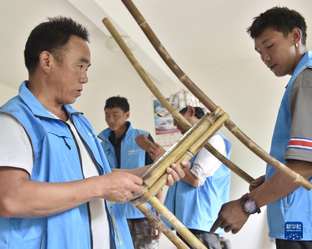 9月15日,西藏定結縣陳塘鎮農民、夏爾巴竹器手工藝傳承人加布(左一)指導村民編制竹器。新華社發(索朗羅布 攝)