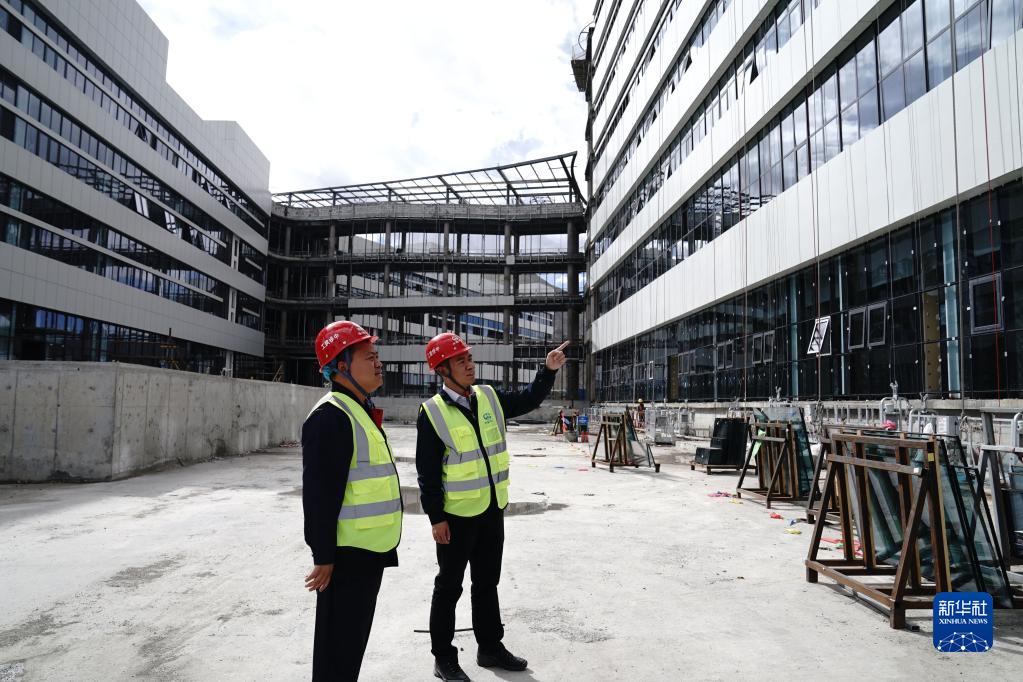 中鐵建工集團西藏自治區(qū)醫(yī)院項目經(jīng)理張磊(右)與項目黨支部書記王曉飛(左)查看施工情況。(2021年9月18日攝)。新華社記者 劉洪明 攝