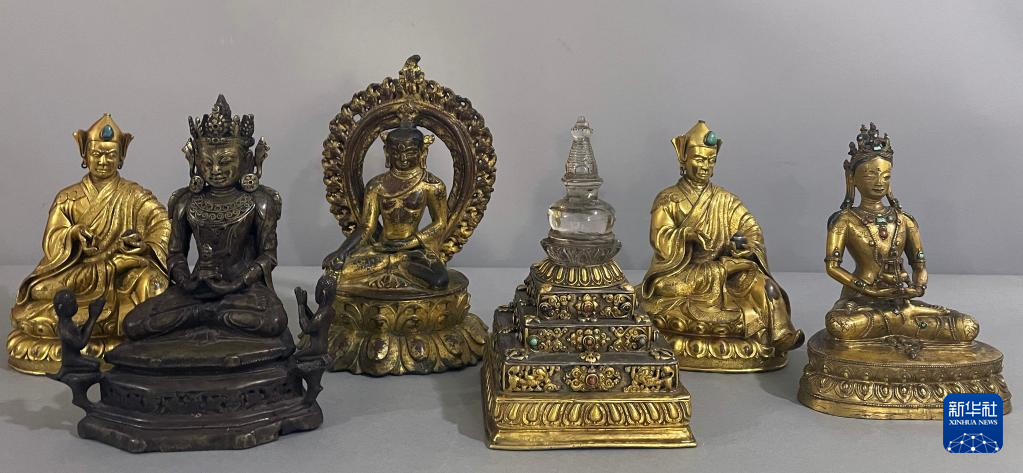 經(jīng)過(guò)鑒定研究,專家認(rèn)為該批文物藝術(shù)品年代跨度主要為明清至民國(guó)時(shí)期,珍貴文物6件,一般文物2件,藝術(shù)品4件,總體上為我國(guó)西南地區(qū)典型器物,具有比較重要的歷史、藝術(shù)、科學(xué)價(jià)值。其中,5件金銅佛造像和1件銅鎏金水晶嵌寶石供養(yǎng)塔制作工藝精良,專家建議暫定為三級(jí)文物。特別是1尊明末清初的黃銅同侍從無(wú)量壽佛造像,呈現(xiàn)出顯著漢藏融合風(fēng)格,其六面形臺(tái)座多見(jiàn)于漢藏風(fēng)格唐卡與壁畫,在銅造像中較為罕見(jiàn)。