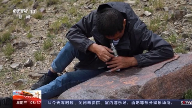 總臺記者 陳琴:現在我們是跟隨科考隊員來到了海拔4700米的加林山巖畫這么一個分布區域,這里的位置就是在尼瑪縣榮瑪鄉依布茶卡鹽湖的旁邊,我們看見科考隊員正在對這幅巖畫進行登記和記錄。