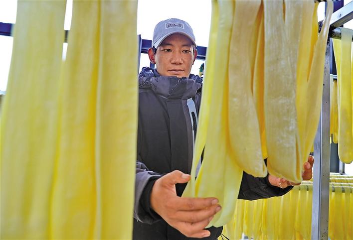 那曲市噶爾德生態畜牧業發展有限公司員工正在晾曬奶制品“拉拉”。丹增群培 唐斌 攝