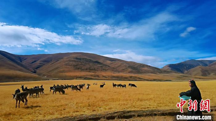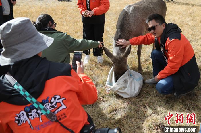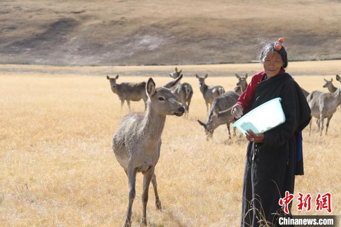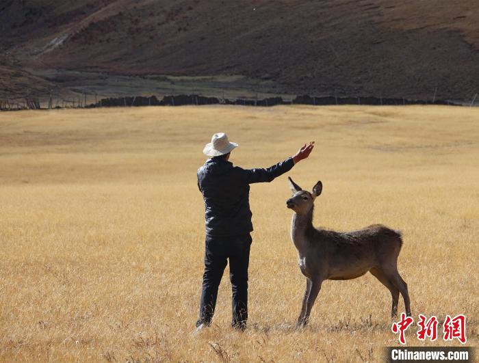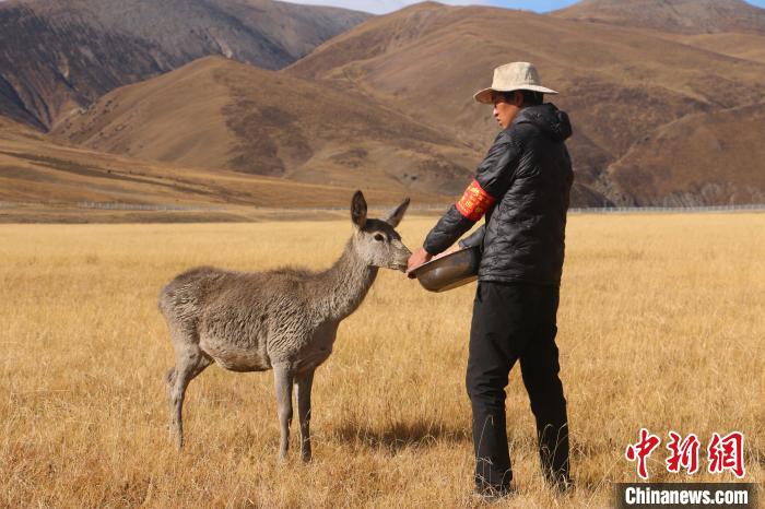 圖為西藏類烏齊馬鹿國家級自然保護區的管護員正在飼喂馬鹿。冉文娟 攝