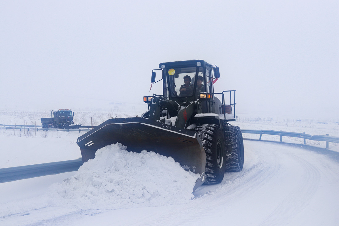 圖為武警官兵利用除雪車清理路面積雪結冰。