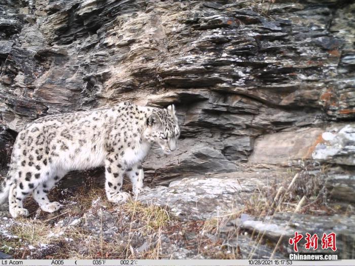 資料圖為2021年10月28日在西藏自治區丁青縣境內由紅外相機拍攝到的雪豹活動影像。 中新社發 山水自然保護中心 供圖