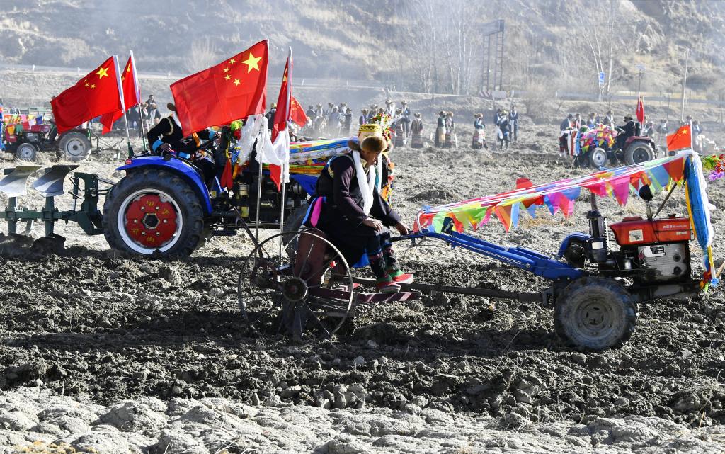 日頭漸高,春耕儀式準備就位。門中崗社區黨總支書記央金卓嘎說:“開耕嘍!”頓時,14臺拖拉機發出隆隆轟鳴聲,肥沃的田地被犁出一道道深深的壟溝。