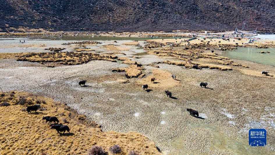 西藏娘亞牦牛養殖產業發展有限責任公司的牦牛在牧場上活動(3月30日攝,無人機照片)。新華社記者 周荻瀟 攝